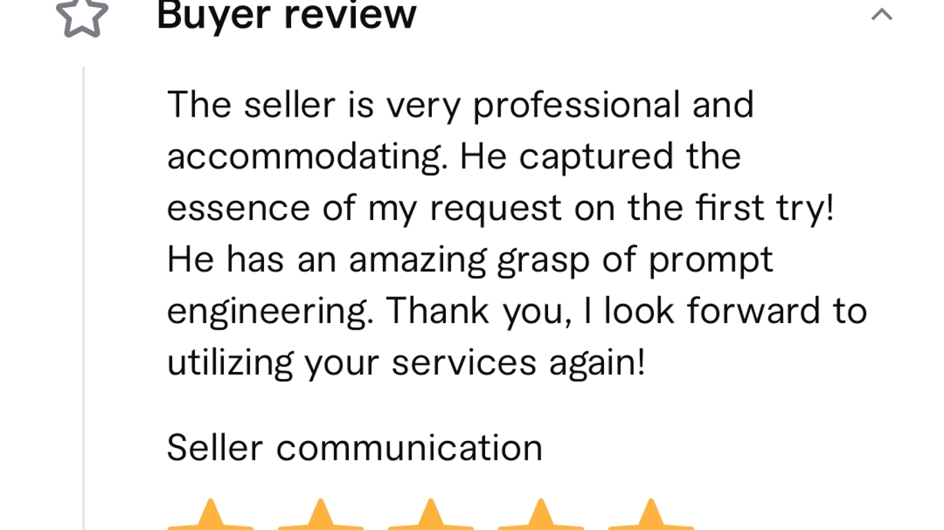 The seller is very professional and accommodating. He captured the essence of my request on the first try! He has an amazing grasp of prompt engineering. Thank you, I look forward to utilizing your services again!